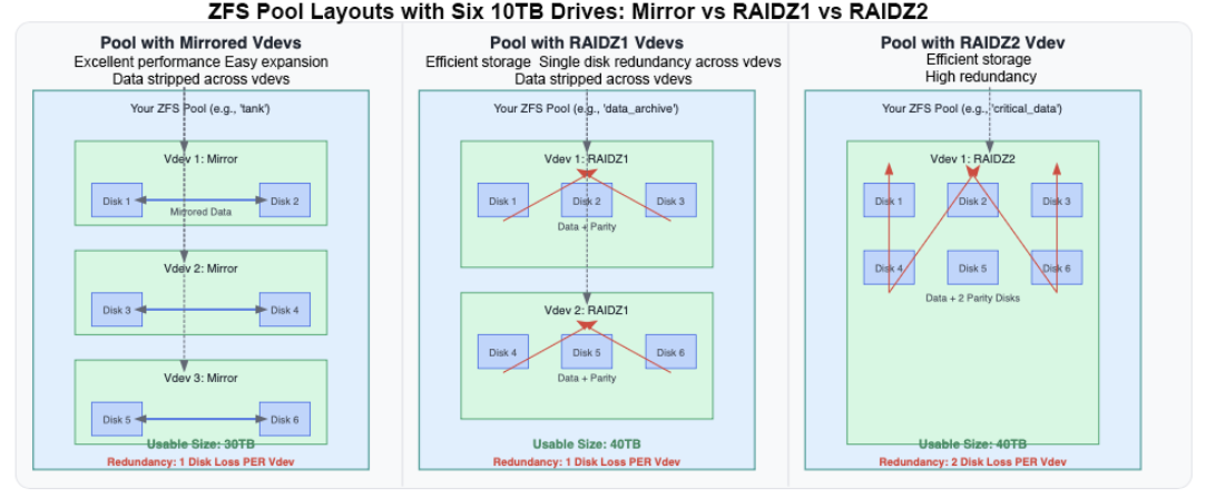 • ZFS stripes data across vdevs, not individual disks, so more vdevs can lead to better performance for workloads with many small files or random I/O.